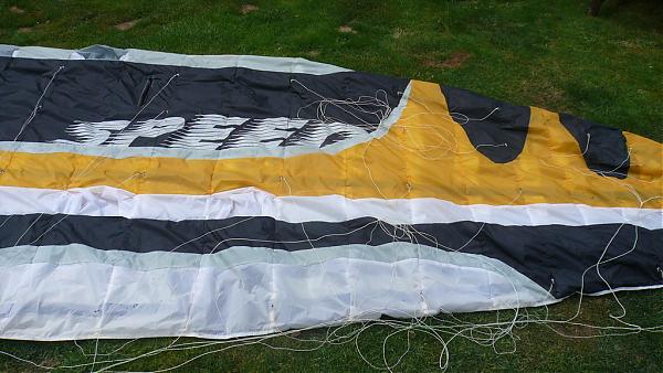 It's not new, I have used it, but it is in good condition. There is 1 small tear that I have repaired with repair tape, it has not spread at all and does not affect the flying in any way. You can see the repair in the photos with my hand for perspective, but you don't notice it at all while flying.