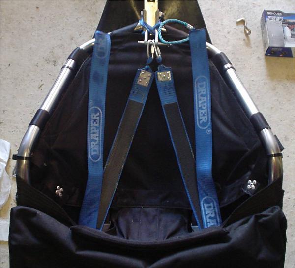 2. Ok...need your comments please... Just finished building a three point harness to strap my fat butt into my buggy…gonna try and get it and me of the ground. The straps are from a Draper ratchet strap thing and are rated to 2000kg. The 'Chicken loop' is made from highly polished steel and pulls out easily from the central D link even when under a lot of load.... The lap straps go thru the seat, under the axle and back over to the glued and stitched Velcro. I cannot pull the Velcro apart latterly. Never jumped before and not sure if this is gonna work...pretty sure it will...but would welcome some polite responses.... Cheers