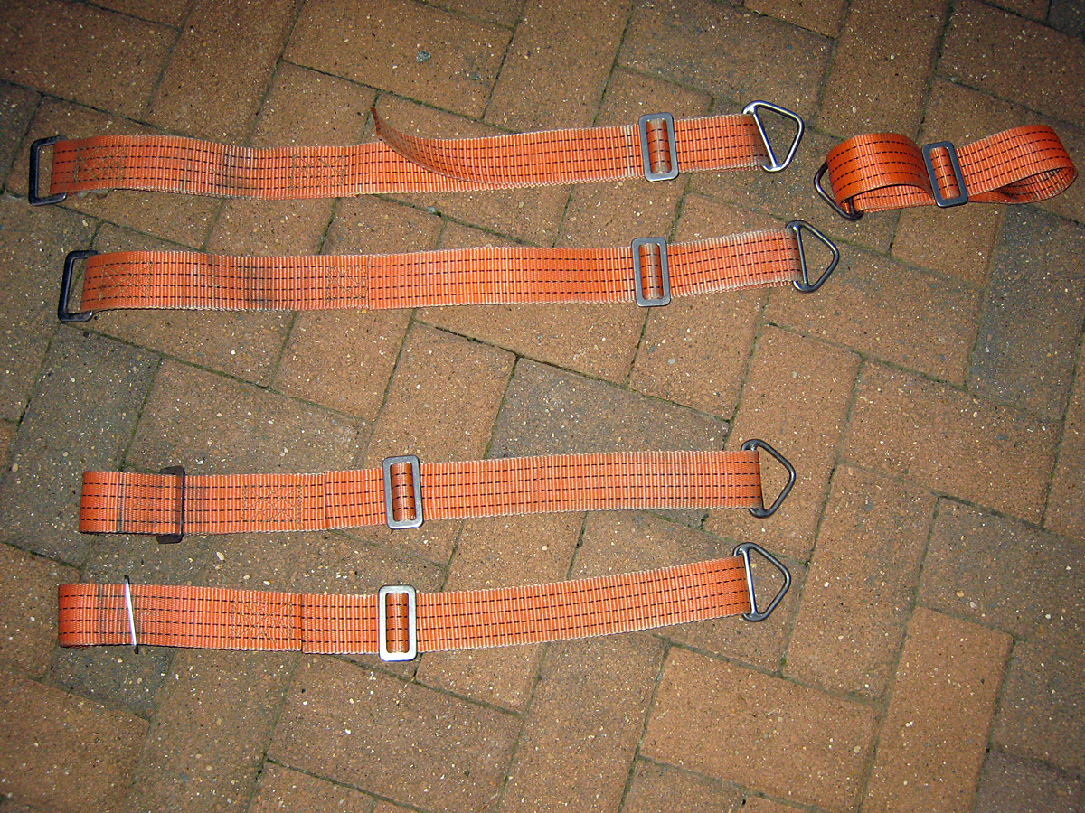 9. 3 piece set and a 2 piece set for sale. Professionally made and bombproof. Fittings are A4 stainless so they won't be rusting in a hurry. A bit faded but still ultra strong. £12 each set, £20 for both, posted. Note that you use these belts ENTIRELY AT YOUR OWN RISK. Your body will snap long before these belts will if you get it wrong.