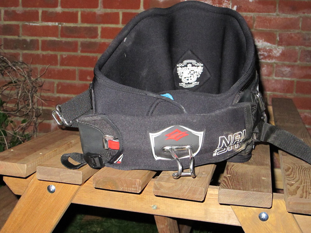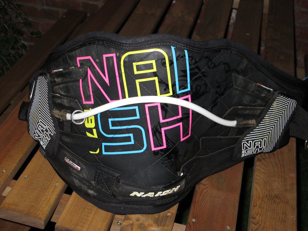 Near brand new Naish mission waist harness. xl size bought 2 months ago brand new (im pushing a 36" waist and its got room up and down) used once. Black with kinda retro pink/skyblue/yellow NAISH