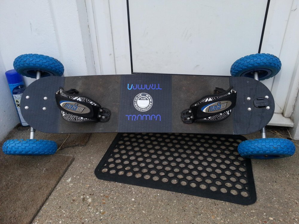 selling my trampa board with skate trucks, mbs footstraps and blue tyres.