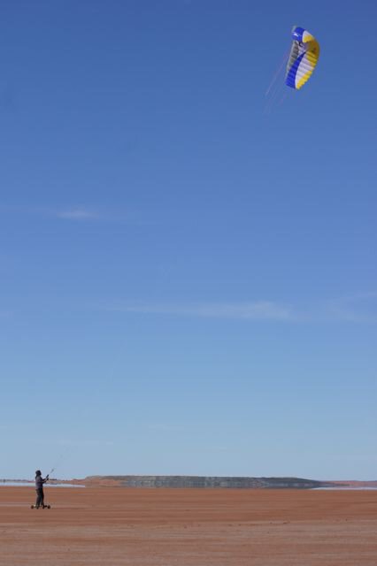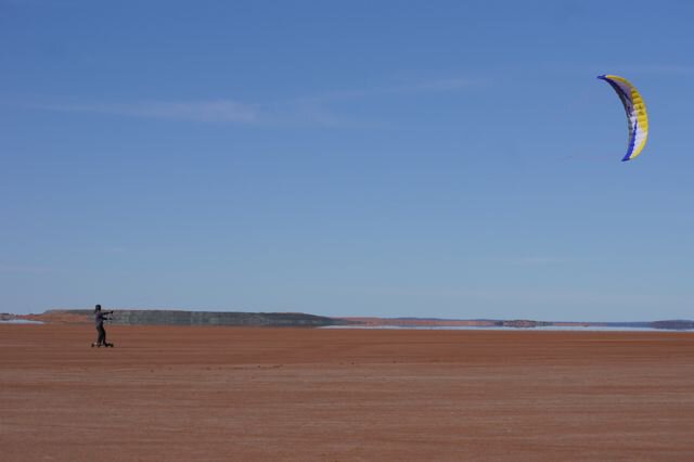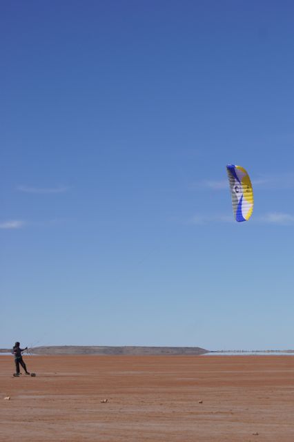 Dont be too jealous its lake lefroy in kambalda wa goldfields, three and a half hours from the coast , you can see the waste dumps of the mines in background. i think its a few hundred km square area so yea not a bad place too learn and a couple minutes from my door. working a 2 week on one off roster so able to get a good go (wind cooperating) on my weeks break . As far as i know only and first to landboard here , a few blo karts go out occasionly further along the lake . Now ya know how i feel when i see the beach you lucky buggas have. cheers Feral