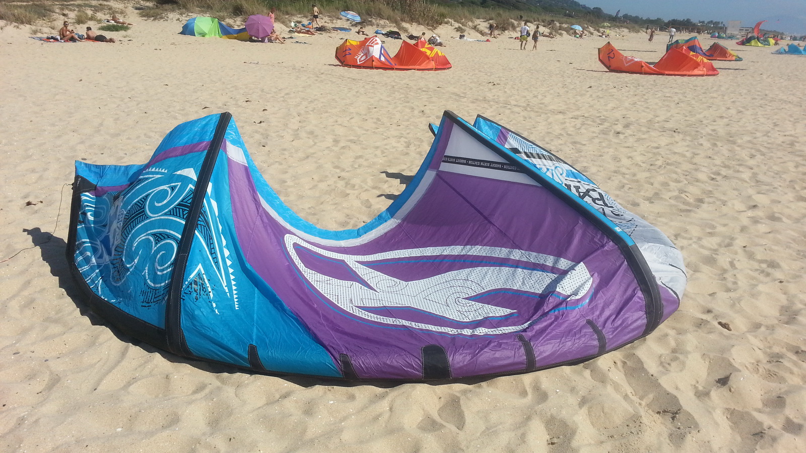 12m Purple and Blue. Good condition, 2 professional repairs of 3mm holes - see deep purple patch and larger black patch on right side leading edge in photos. No bladder punctures or canopy rips. Valves, hoses, bridles, everything else in great condition. 2013 bar now fitted with 2014 quick release chicken loop (not shown in pictures). Bar had new lines at start of 2014. Bag a bit tatty. Amazing kite for all conditions/types of riding.