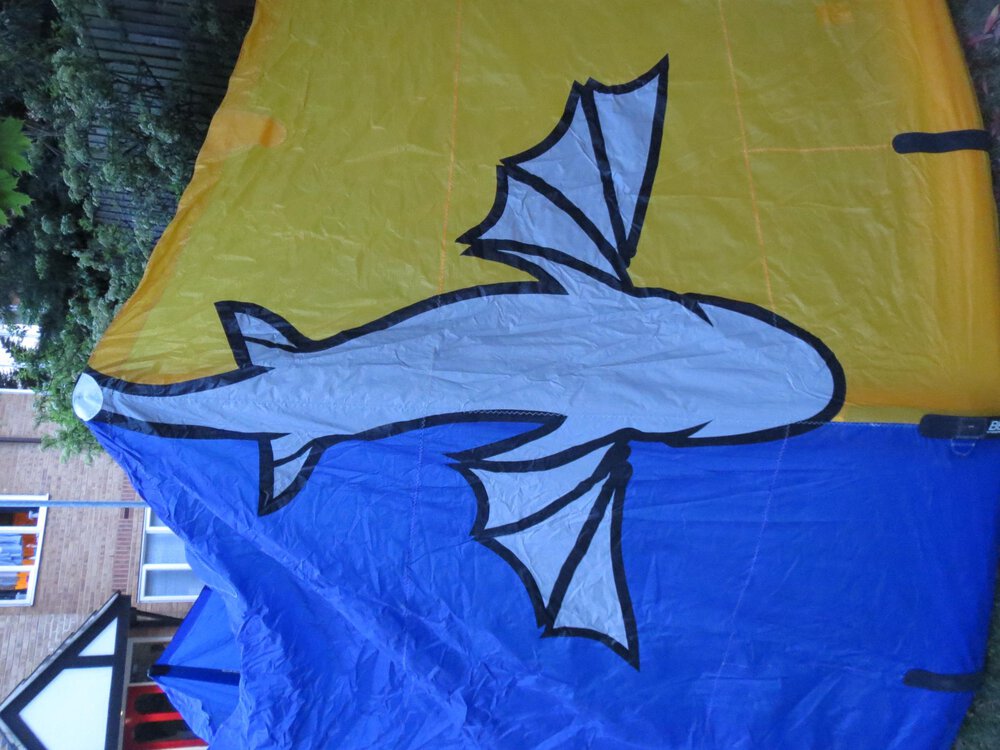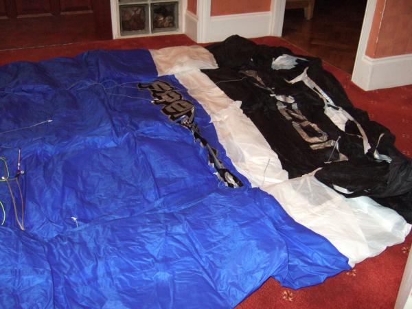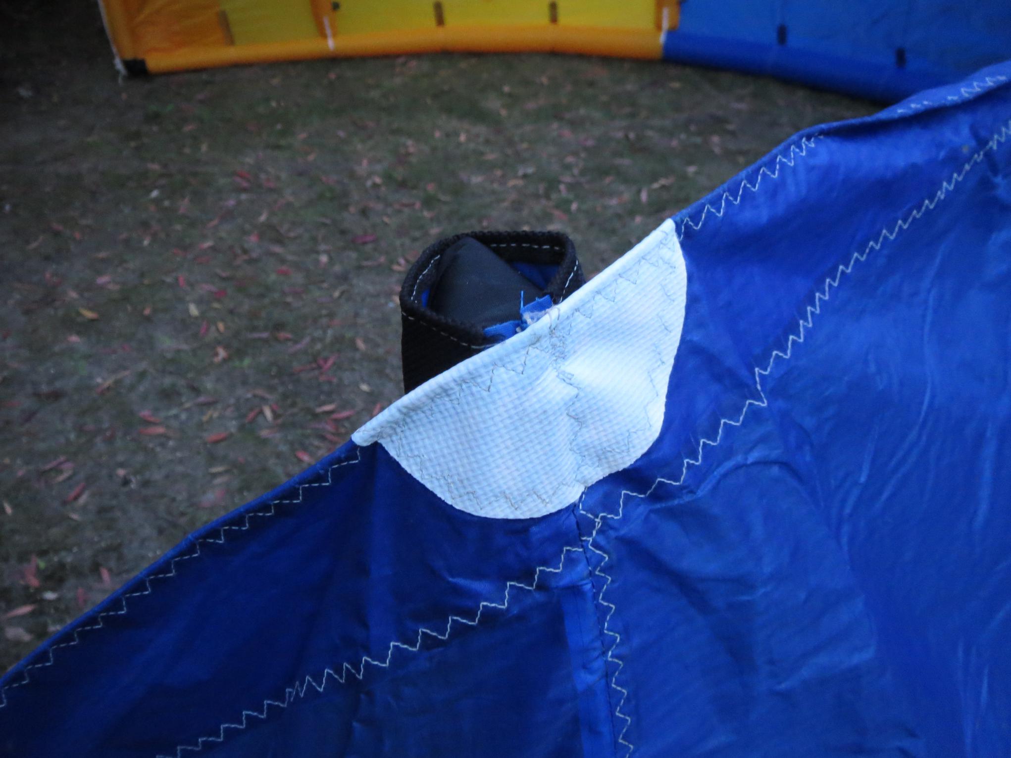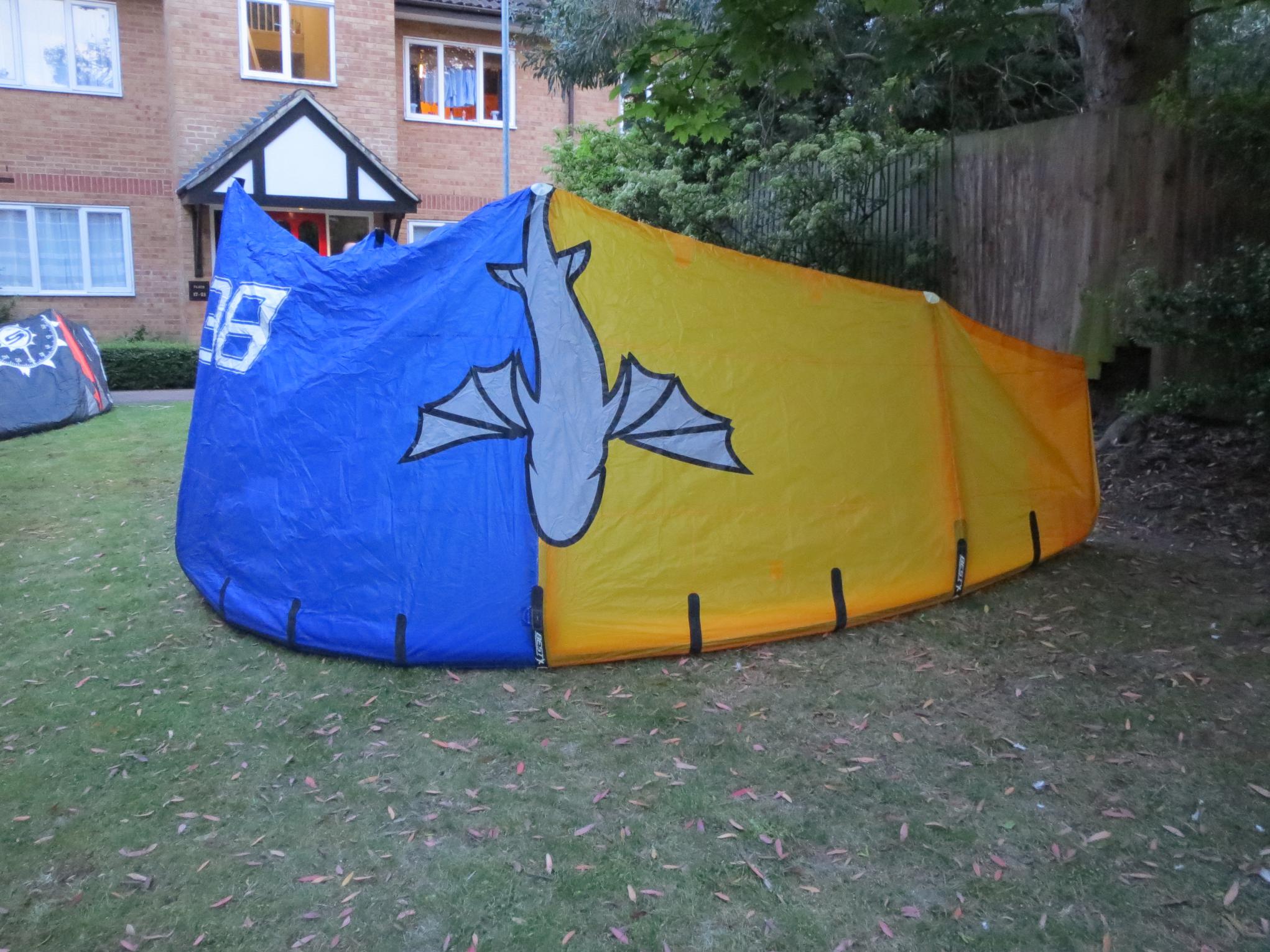 9. Hi, Dark outside so took some pics indoors, so limited space to stretch it out. As you can see the whites are completely clean, as is the rest of the kite. Check out the closeups of the bar and line ends, and you will see no wear whatsoever. Its been stored indoors since new. The bag even has the original tag and serial number strip on it. Cheers, Tim