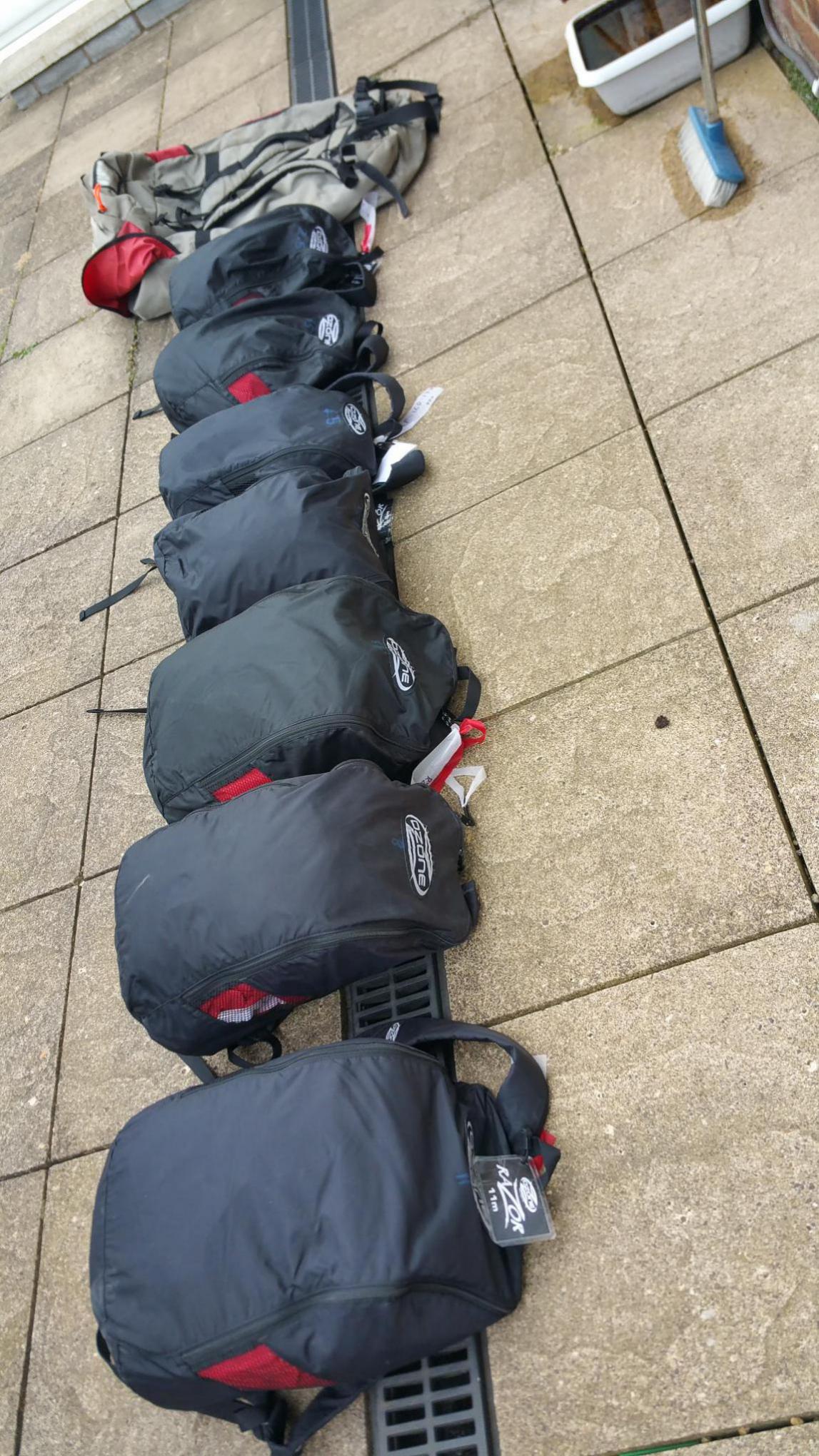 1. From 2.5 through to 11m, all with lines and handles. Excellent condition but the 11m has a very small repair in the canopy. £800 for the lot. Postage £20 to the UK, at cost to post overseas. Very Heavy though!