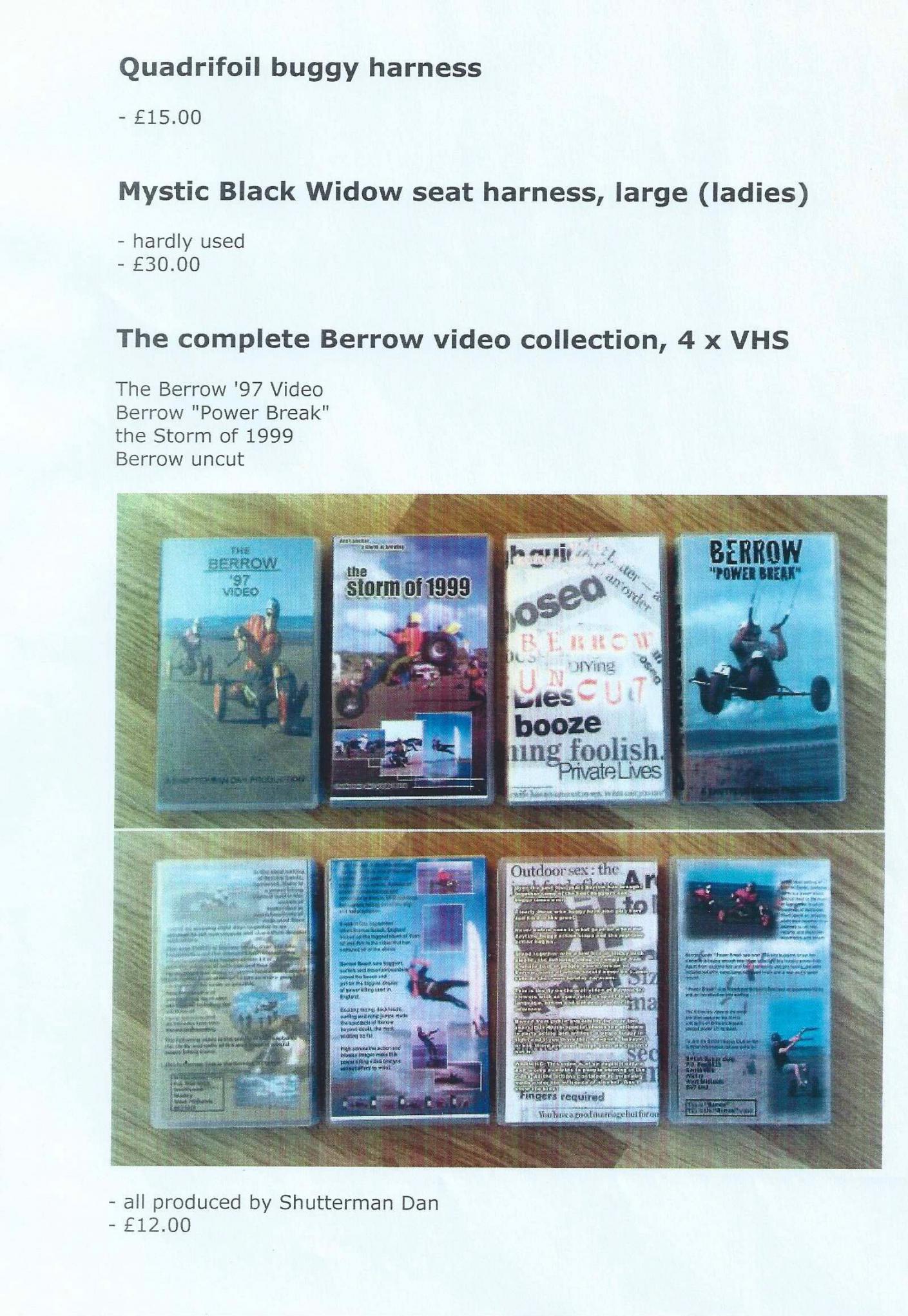 6. Parastorm Typhoon II buggy http://noise.aeolian.co.uk/2011/parastorm-1.jpg http://noise.aeolian.co.uk/2011/parastorm-2.jpg http://noise.aeolian.co.uk/2011/parastorm-3.jpg - wide axle version - slightly wider tyres than standard - original carry bag - wheel bag Buyer collect Sold -------------------------------------------------------------------------------------------------------- Sky Kites 5.3m Predator II (orange) http://aeolian.co.uk/kites/buggy/berrow00/day8/big_2689.jpg - includes Flexifoil handles & 100ft lines - superb traction engine £140.00 ono -------------------------------------------------------------------------------------------------------- Sky Kites 2.2m Predator II (black & turquoise) http://aeolian.co.uk/kites/images/big_1075.jpg - includes handles & 75ft lines - perfect high wind traction kite £85.00 ono -------------------------------------------------------------------------------------------------------- Flexifoil Skytiger Hi 40, Icarex http://aeolian.co.uk/kites/images/buggy1.jpg - includes handles & 75ft lines - classic traction kite - small repair £75.00 ono -------------------------------------------------------------------------------------------------------- 10 foot Flexifoil Stacker (Flexifoil Super 10), rainbow http://aeolian.co.uk/kites/images/flexi1.jpg - includes heavy duty fabric handles & 150ft line £60.00 ono -------------------------------------------------------------------------------------------------------- Quadrifoil buggy harness £15.00 -------------------------------------------------------------------------------------------------------- Mystic Black Widow seat harness, large (ladies) Hardly used £30.00 -------------------------------------------------------------------------------------------------------- The complete Berrow video collection, 4 x VHS: - The Berrow '97 Video - Berrow "Power Break" - the Storm of 1999 - Berrow uncut http://noise.aeolian.co.uk/2011/berrow-vids.jpg All produced by Shutterman Dan £12.00