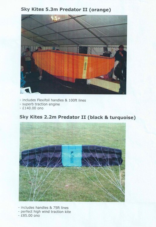 2. Putting the kites (5.3m Predator II, 2.2m Predator II & Flexifoil Skytiger Hi 40 Icarex - all with lines and handles) on eBay in next few days with better photos. Mystic harness and Berrow videos still available.