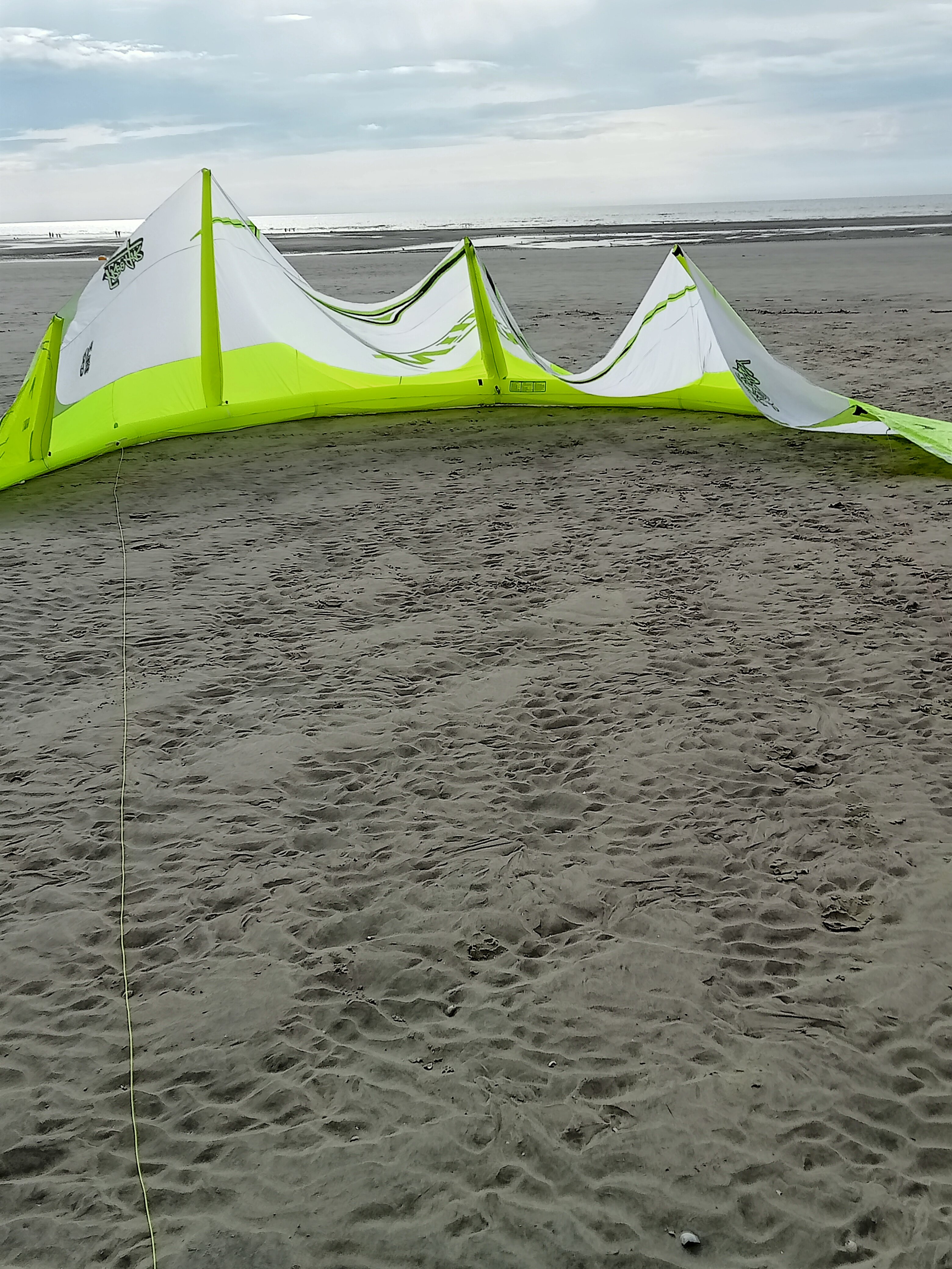 It is not the prettiest kitesurfing kite in the world. It was bought second hand for £150 and came with a Peter Lynn Bar and depower kit and a set of lines. No instructions were provided so a great deal of experimentation was needed to work out how to set the kite up properly.