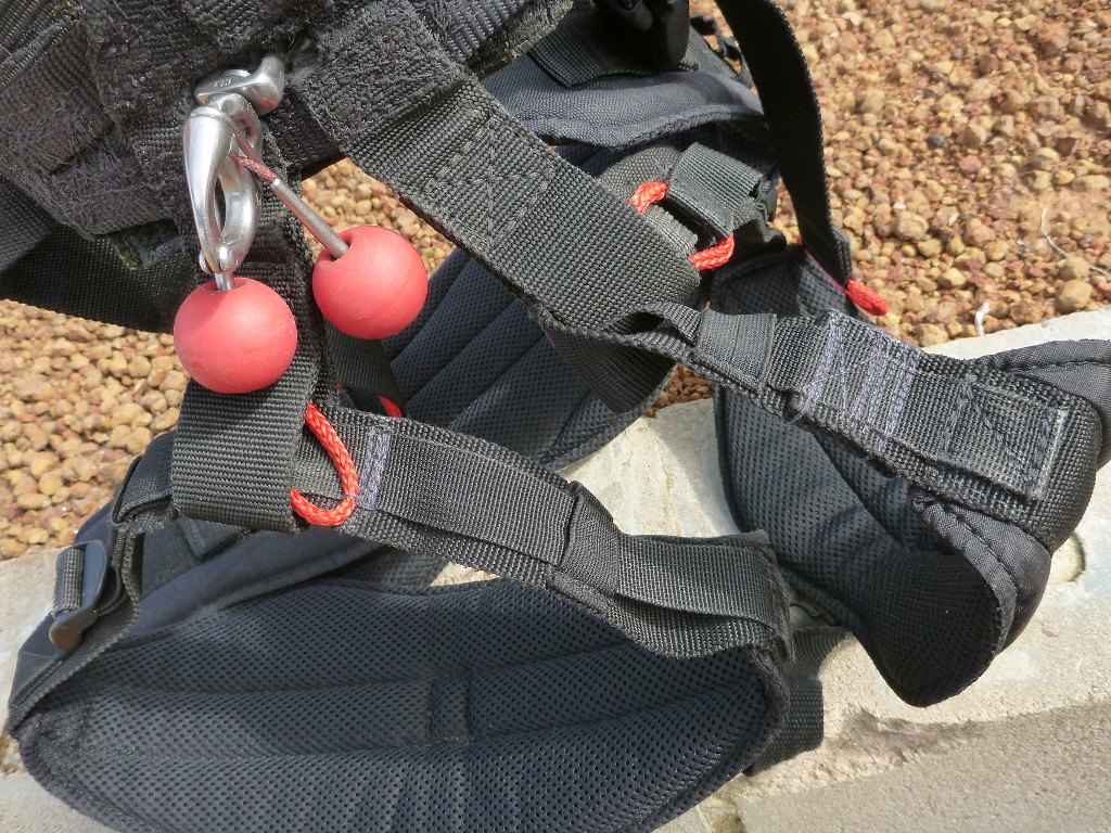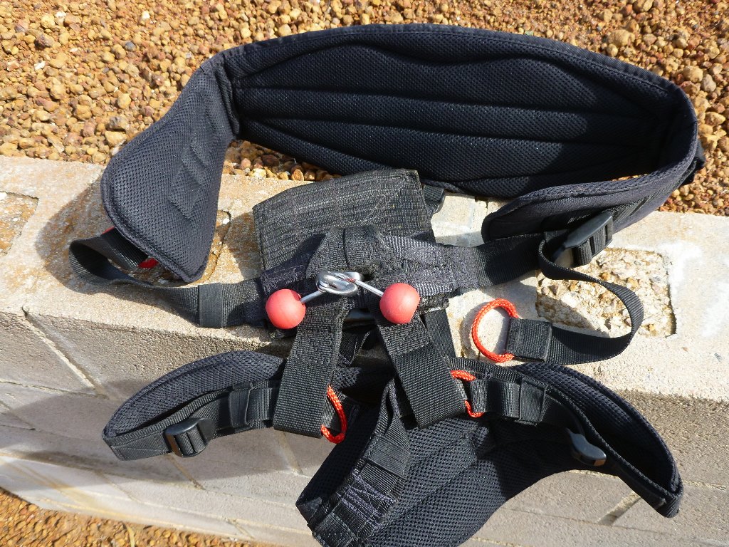 The harness is designed like a rock climbing harness, with ergonomically designed leg straps to prevent it riding up. It has loads of padding in the legs and back-straps and the spreader is attached to the leg straps to prevent it tilting. Its is made from tough, but light-weight nylon and comes with a spliced Amsteel back leash line or cargo attachment for towing (designed for snow kiting).