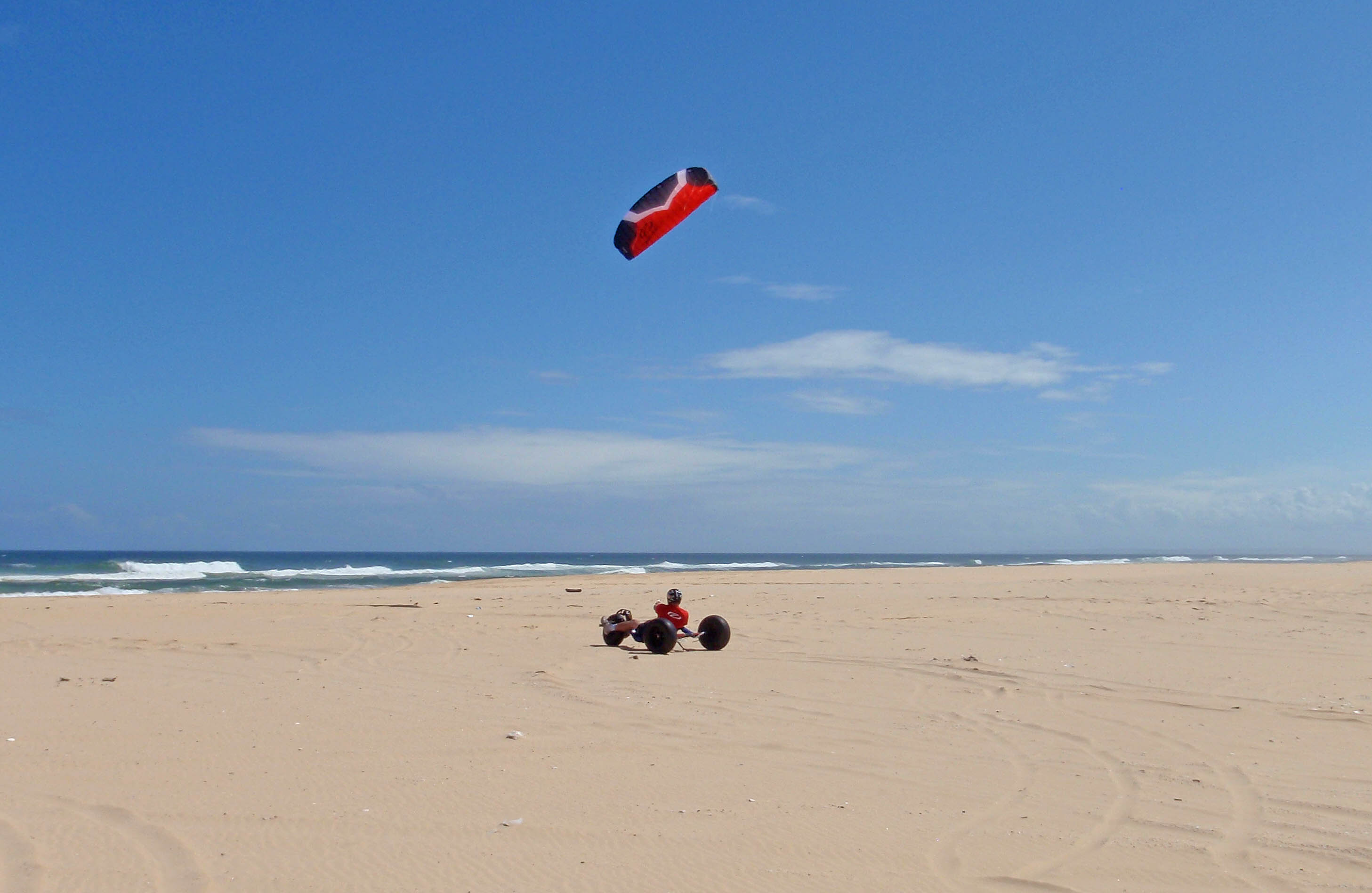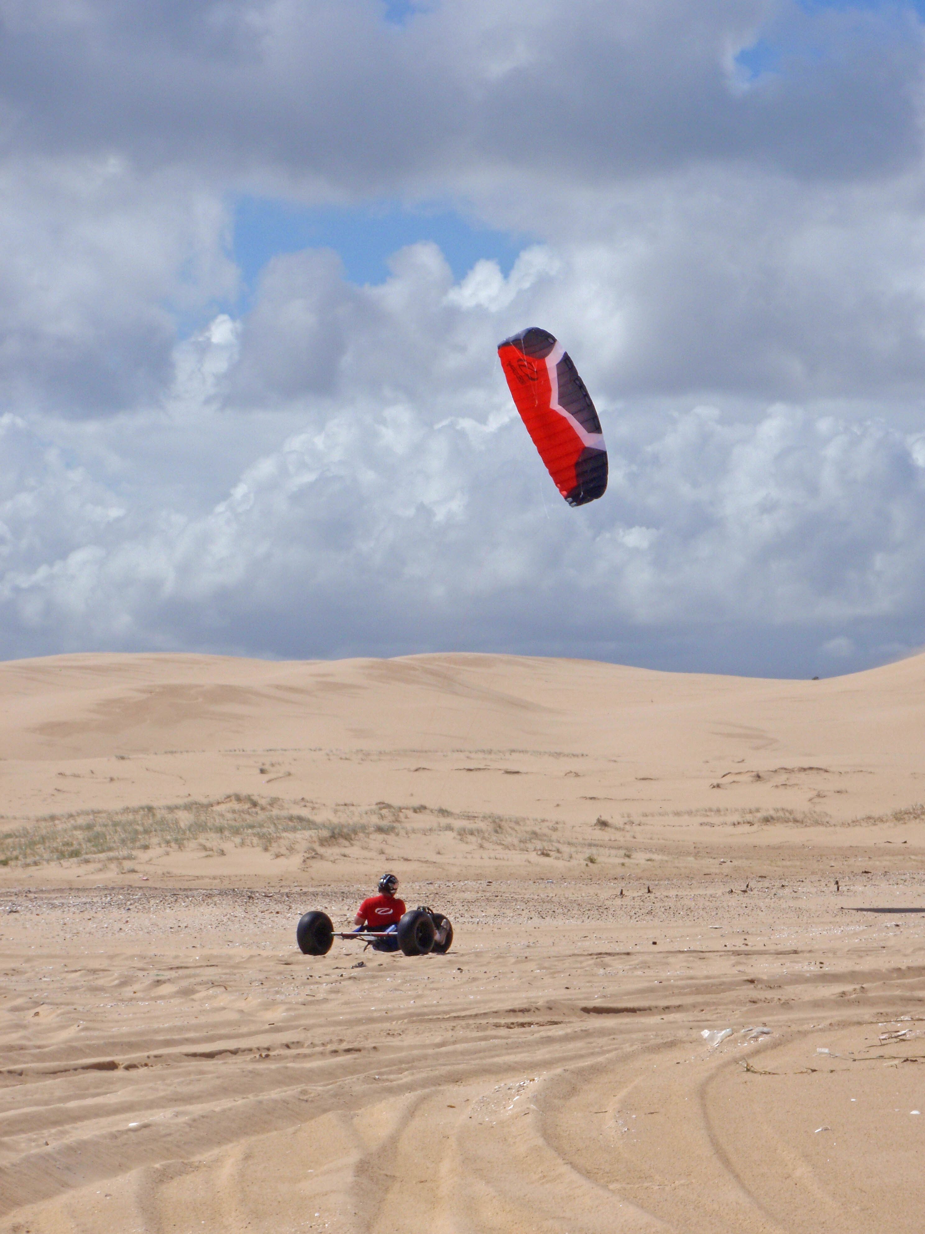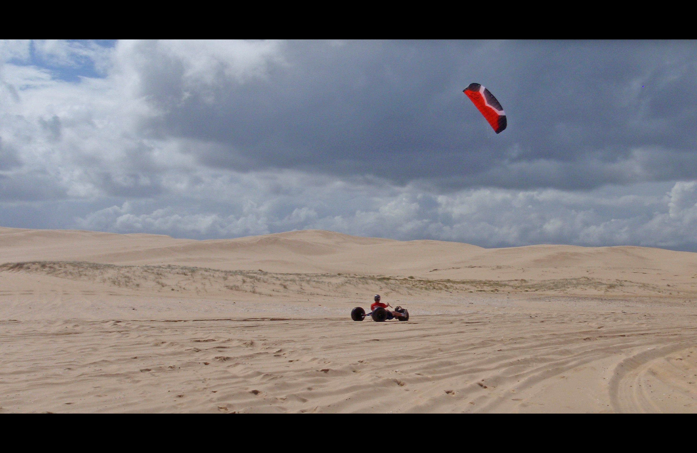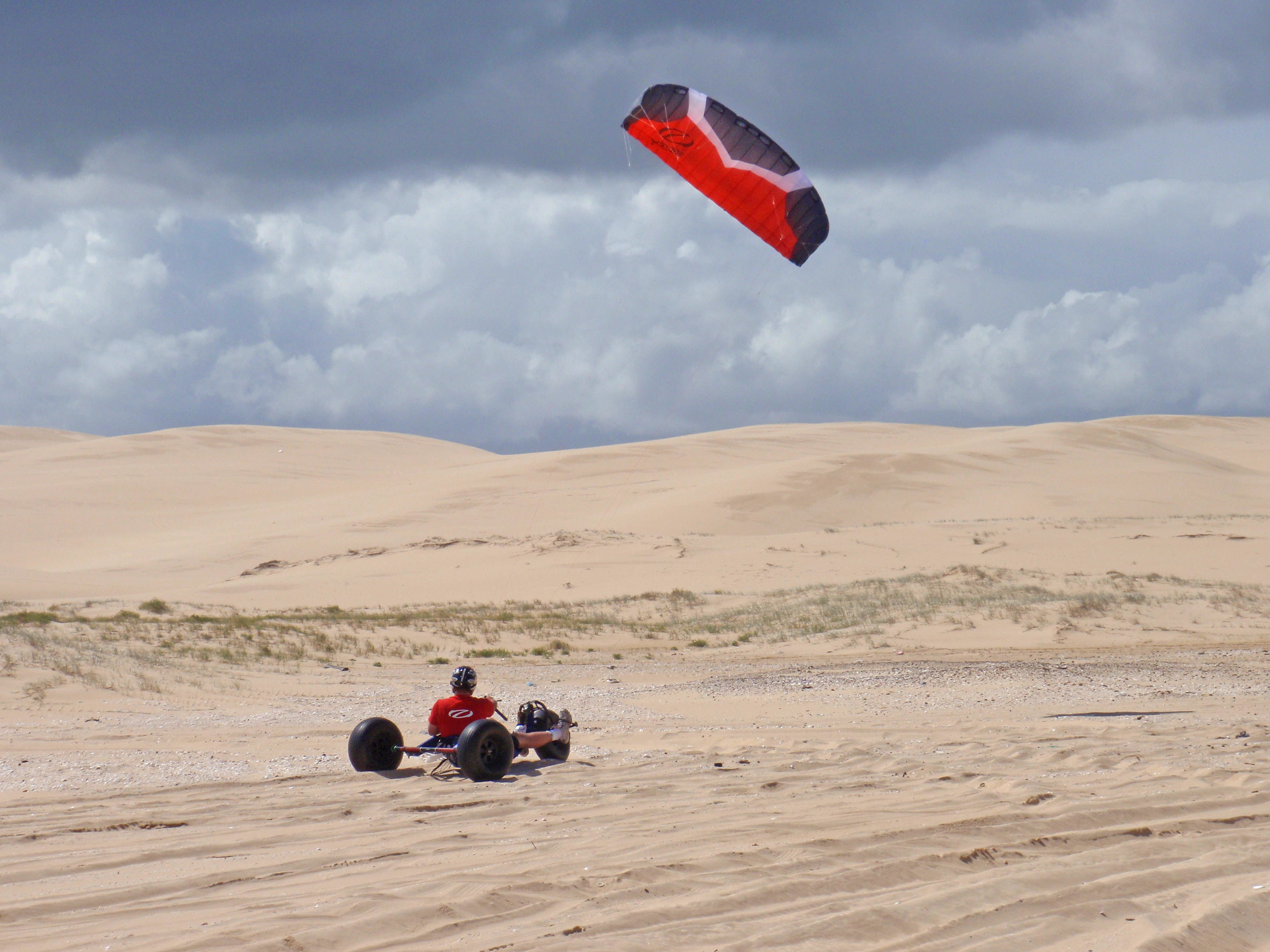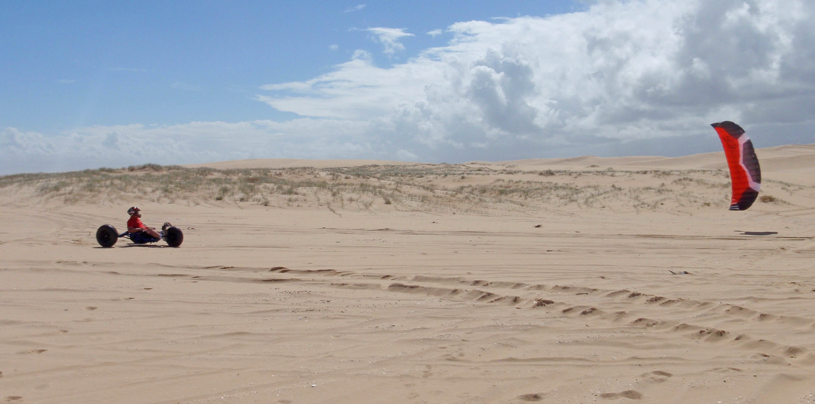 Well it was time, facing into the dunes I gave the kite what it wanted and dropped it right into the guts of the power. As soon as the kite dropped in from the top there was a nice grunty feel and I knew that it was on. Hanging the kite out @ 15 knots there was no problem pulling me and my buggy through the soft sand and out to the dunes out the back.
