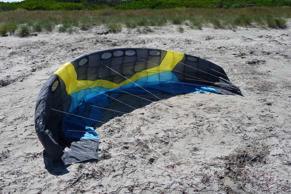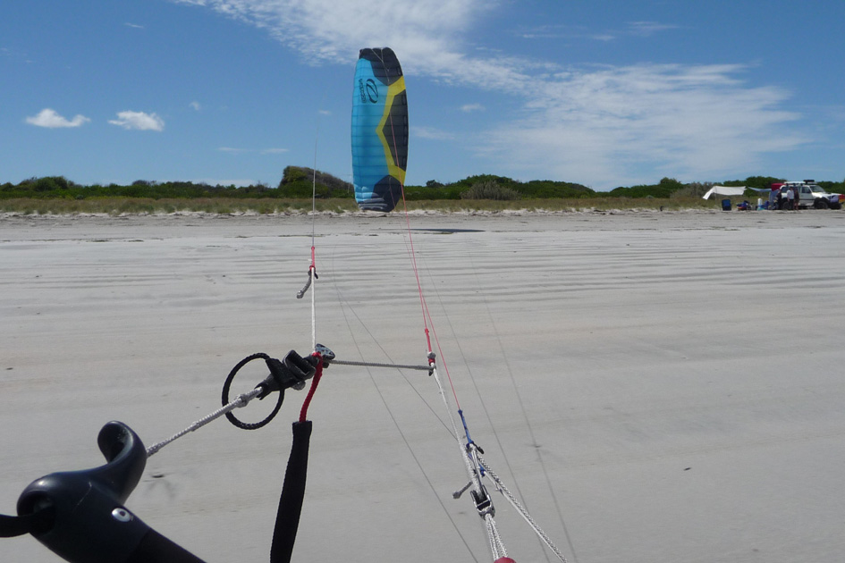 Now for those that know Gerroa, the last 50-100mtrs where the trees end and there the flat sand before the river mouth was the best section, with adequate speed travelling into that section I could start to feel to pull of the kite as wind would be a little stronger and a bit more on shore. It was a nice feeling not a sudden jolt like a race kite but like you were just slowly opening the throttle on a powerful motor, pulling smoothly and very controllable steering wise no sudden twitchyness. The only problem I foresaw was the river/water just as the fun began 'buggar'. Yes you can throw the kite up in the air without the fear of going skyward (this maybe an illusion as it was only a 4m and I'm used to larger Blades). At this end of the beach was the only time I felt I could stop working the kite, park it and apply a small amount of brake to increase pull and get to really feel the potential although very short lived