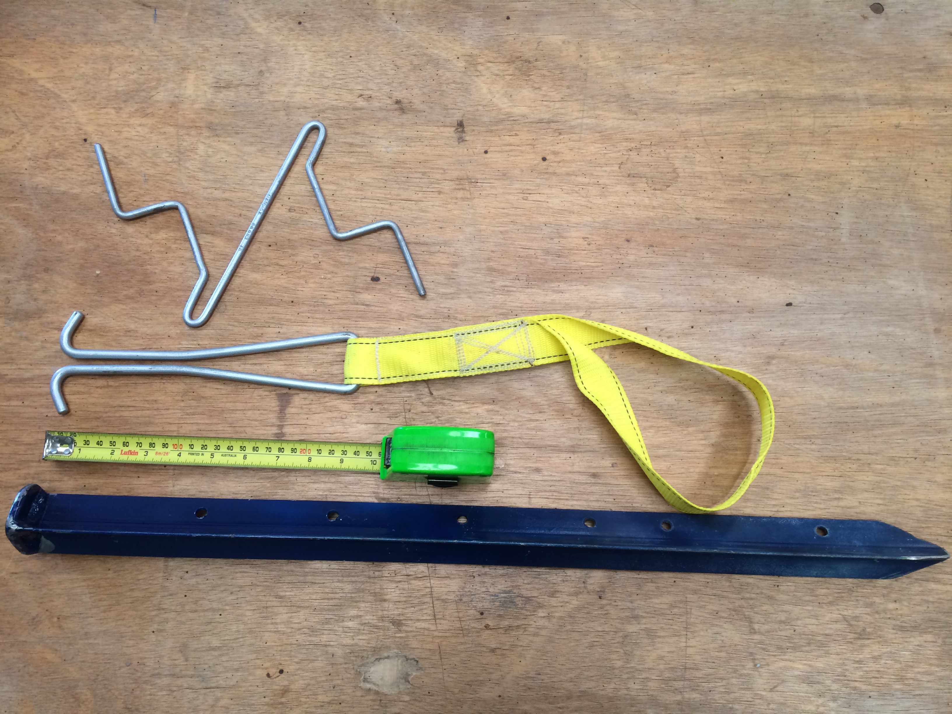 Darren Tibbey Posted August 4, 2017 Author Report Posted August 4, 2017 9 hours ago, Chook said: Yeh this above seems to fit my bill as the anchor point but time will tell. My hassle was when there is a wind shift which always happens here, I had lines tied everywhere and struggled to move them all at once. Hopefully this will simplify that. I have 2 big sand anchors each 1200 x1200 heavy PVC tarp with reinforced edges and straps. Lots of stakes and pins that weigh a ton. I like to over kill with stacked crossed stakes for peace of mind. In really hard ground I just use a single stake. I just carry a cordless drill with a long 10mm masonry bit, I use as a pilot hole to get them in. Easy to remove as you pour a drink bottle of water round them 5 mins before you want to remove them. Hammer them in a few more hits to slosh them up and then extract them. To tie off the lines at the moment I use these larks headed onto the end of the stakes. (the yellow webbing) By pulling the line down in between the arms and figure 8 weaving the line round them it ties off the line. It's easy to undo and no knots required. The tighter they pull the more they grip the line. The top one in the photo is a stainless line winder I made from 6mm stainless rod. I have lots of sizes. Stakes are 600-700mm galvanized star pickets with a 10mm thick flat bar top welded on and the corners rounded off so they don't skin your shins or burr the picket top when banging them in, helps to retain the webbing as well. Always driven into the ground so the long side of the Y of the picket faces away from the kite, just as they were designed to hold stock in paddocks as fence posts. I also have a stack of "D-bar" concrete reinforcing bar stakes, in 10-12-16mm with large knobs welded to the top for safety if someone happened to fall onto them (probably me). I grid the first 100mm of D's off the bottom of them to penetrate and not disturb the soil so badly deep down, for much better gripping power. Your quite clever fella there @Chook just read how it all works. Whats the biggest stuff you fly? Will it all be held by this setup? Quote