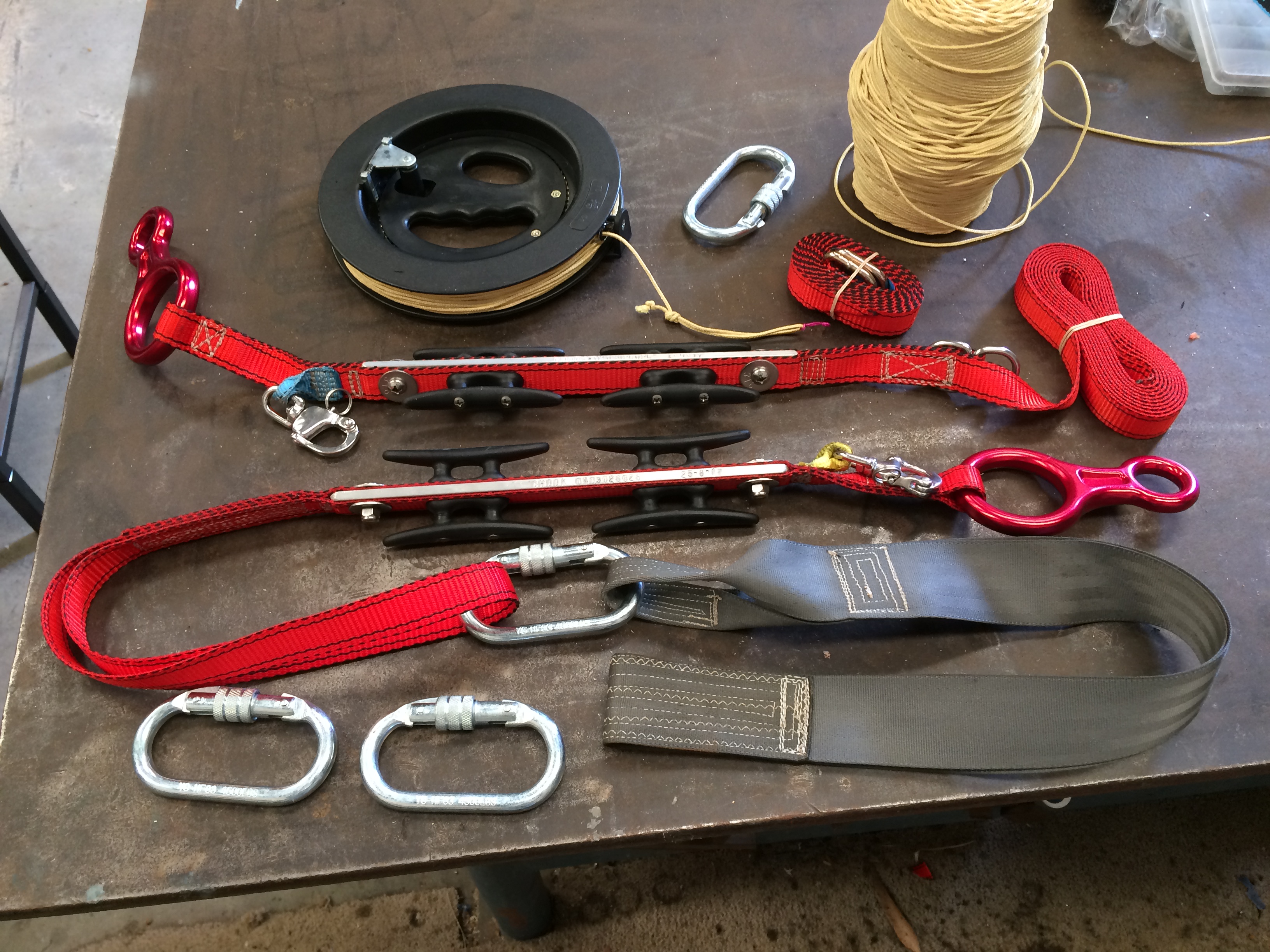 Chook Posted August 4, 2017 Report Posted August 4, 2017 Yeh this above seems to fit my bill as the anchor point but time will tell. My hassle was when there is a wind shift which always happens here, I had lines tied everywhere and struggled to move them all at once. Hopefully this will simplify that. I have 2 big sand anchors each 1200 x1200 heavy PVC tarp with reinforced edges and straps. Lots of stakes and pins that weigh a ton. I like to over kill with stacked crossed stakes for peace of mind. In really hard ground I just use a single stake. I just carry a cordless drill with a long 10mm masonry bit, I use as a pilot hole to get them in. Easy to remove as you pour a drink bottle of water round them 5 mins before you want to remove them. Hammer them in a few more hits to slosh them up and then extract them. To tie off the lines at the moment I use these larks headed onto the end of the stakes. (the yellow webbing) By pulling the line down in between the arms and figure 8 weaving the line round them it ties off the line. It's easy to undo and no knots required. The tighter they pull the more they grip the line. The top one in the photo is a stainless line winder I made from 6mm stainless rod. I have lots of sizes. Stakes are 600-700mm galvanized star pickets with a 10mm thick flat bar top welded on and the corners rounded off so they don't skin your shins or burr the picket top when banging them in, helps to retain the webbing as well. Always driven into the ground so the long side of the Y of the picket faces away from the kite, just as they were designed to hold stock in paddocks as fence posts. I also have a stack of "D-bar" concrete reinforcing bar stakes, in 10-12-16mm with large knobs welded to the top for safety if someone happened to fall onto them (probably me). I grid the first 100mm of D's off the bottom of them to penetrate and not disturb the soil so badly deep down, for much better gripping power. Darren Tibbey 1 Quote